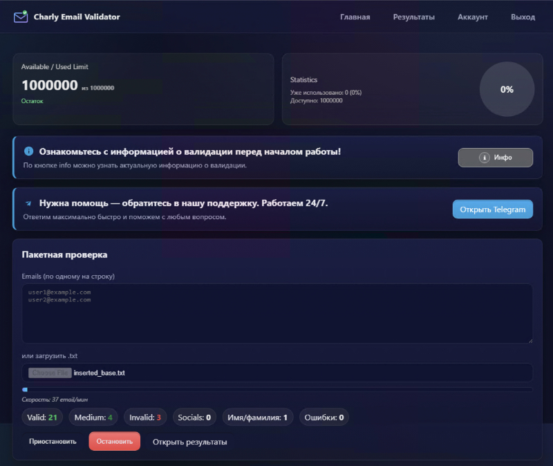 Для этого тебе будет выдан Charly Email Validator, наш облачный софт, который собирает данные о наличии социальных сетей, имена и активность юзеров. В итоге получается не только валидная, но и активная база, которая дает профит.