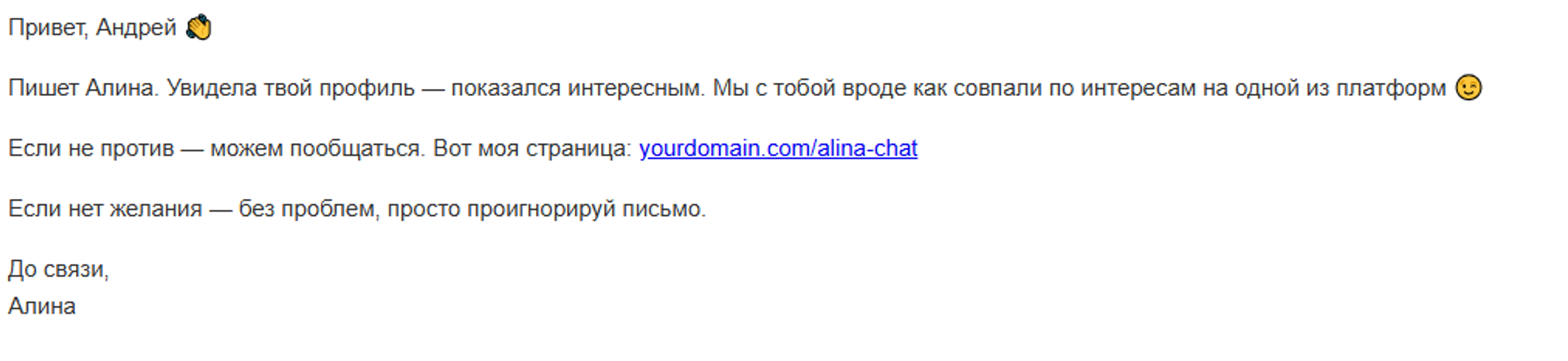 <p>Пишет Алина. Увидела твой профиль — показался интересным. Мы с тобой вроде как совпали по интересам на одной из платформ 😉</p>